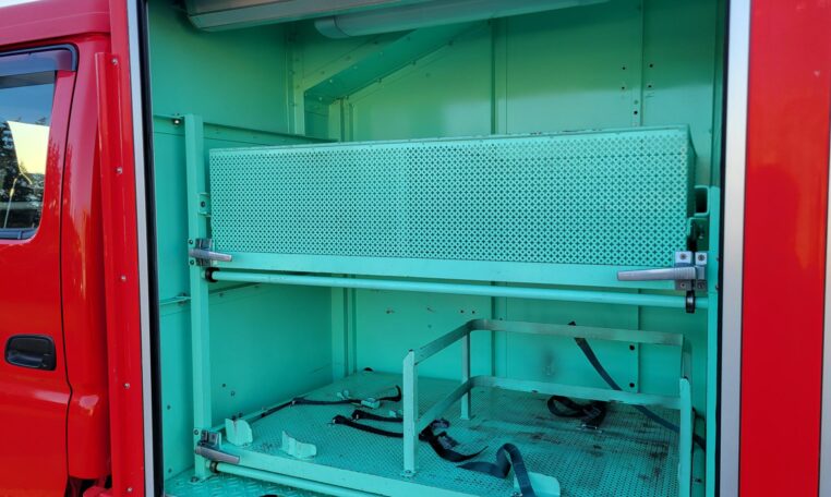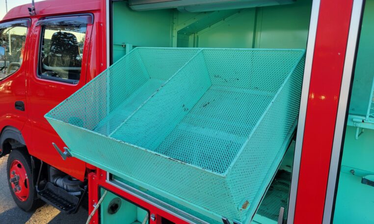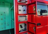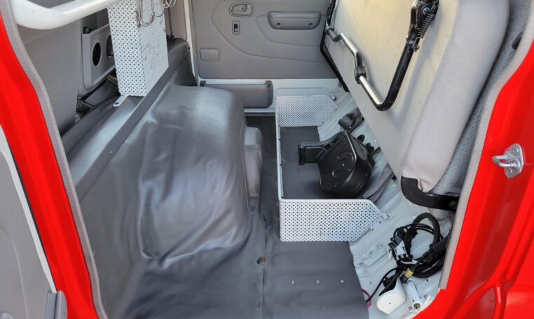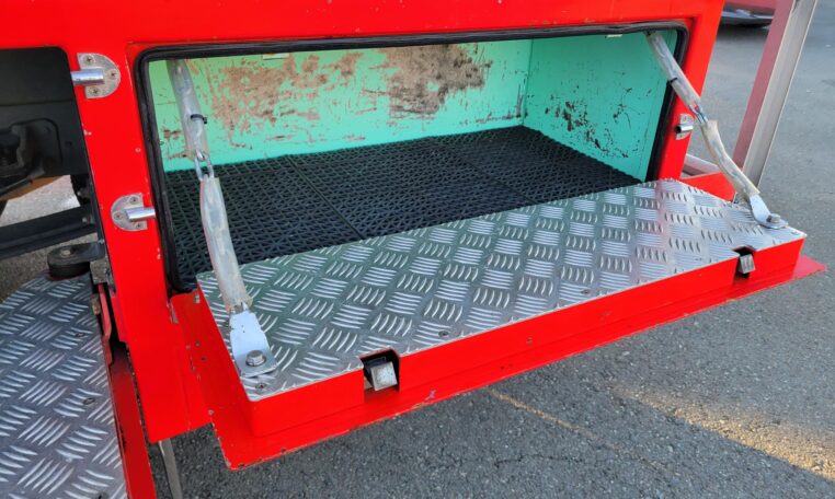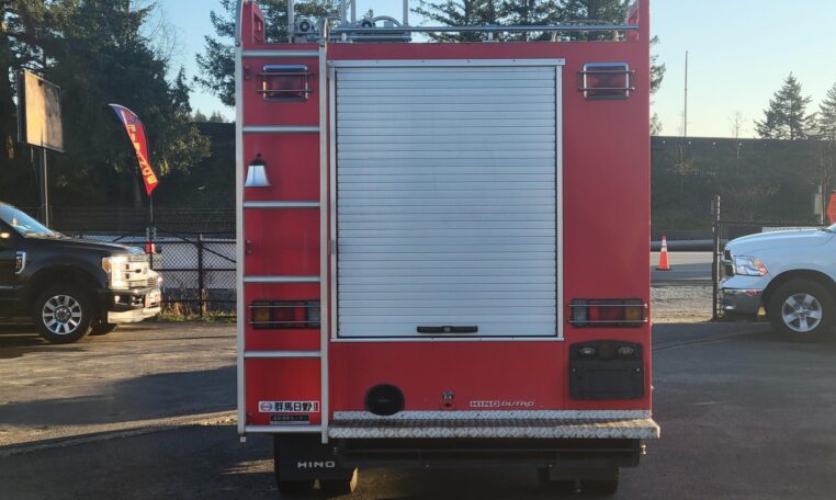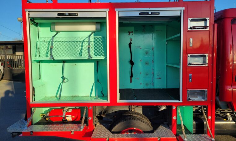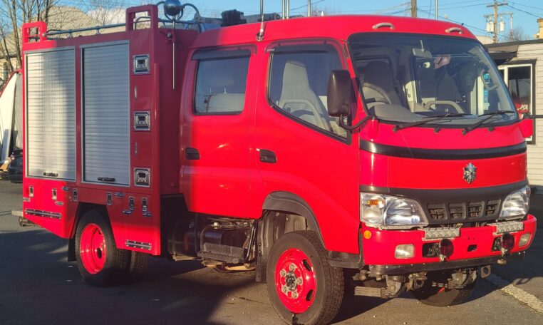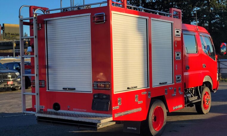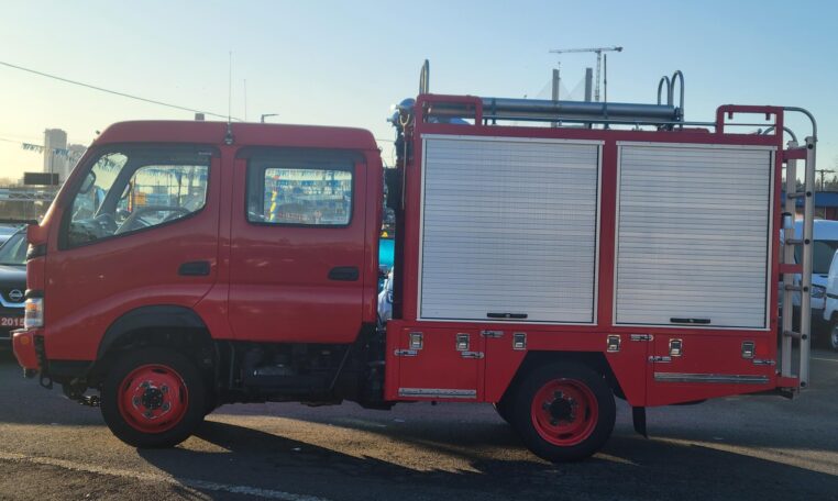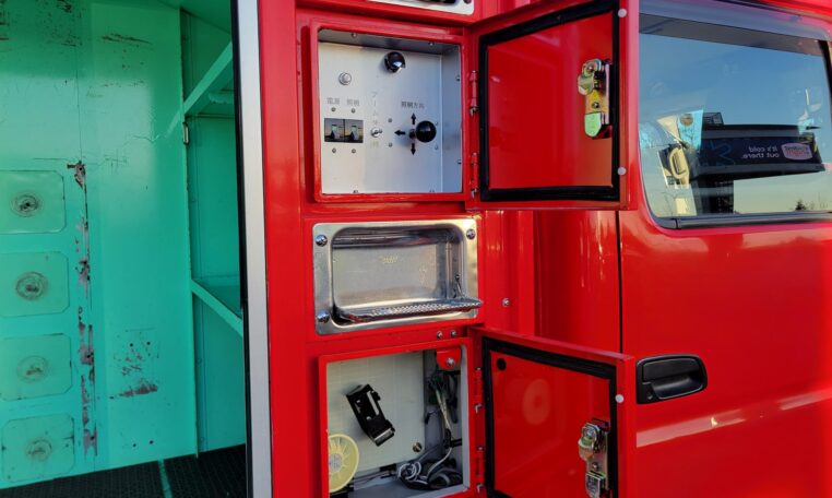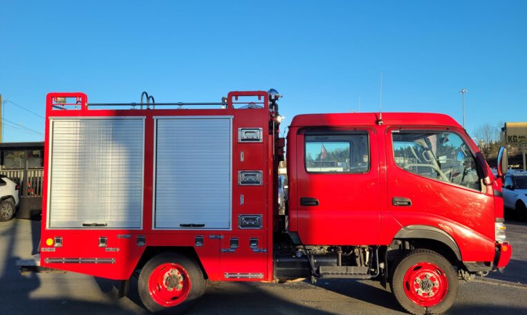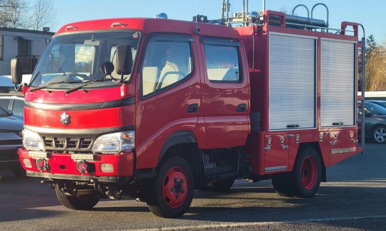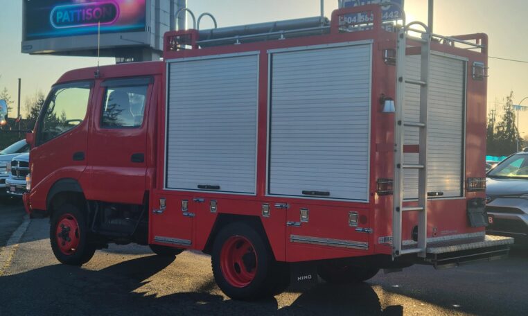 A tank of a unit, Hino Dutro 4WD decommissioned fire engine support vehicle. Unlike actual firetrucks, instead of a water pump, this example features a variety of different size compartments which allows number of uses without box modification. All interior panels are removable. You can increase the size of a compartment you need the most and make one big open space.