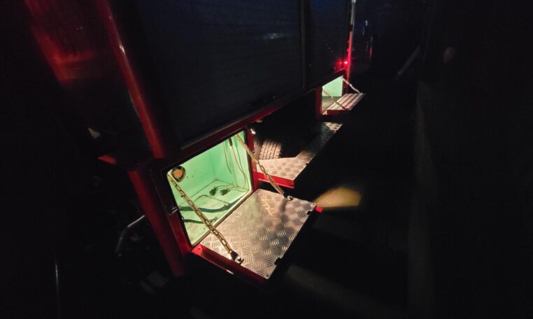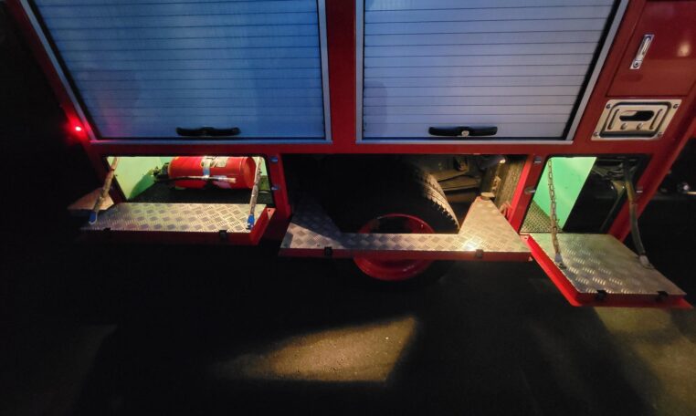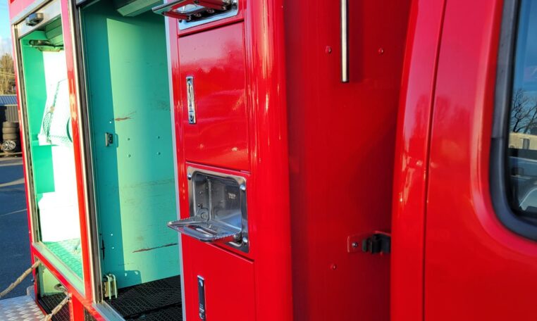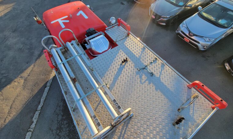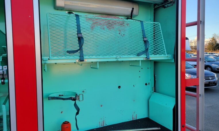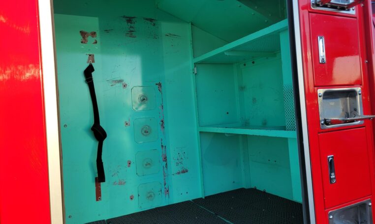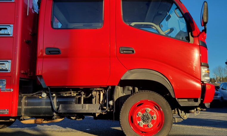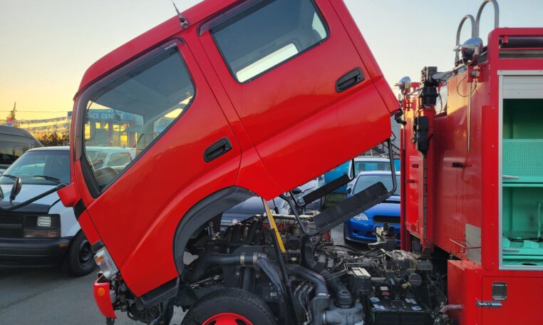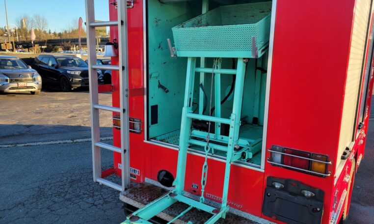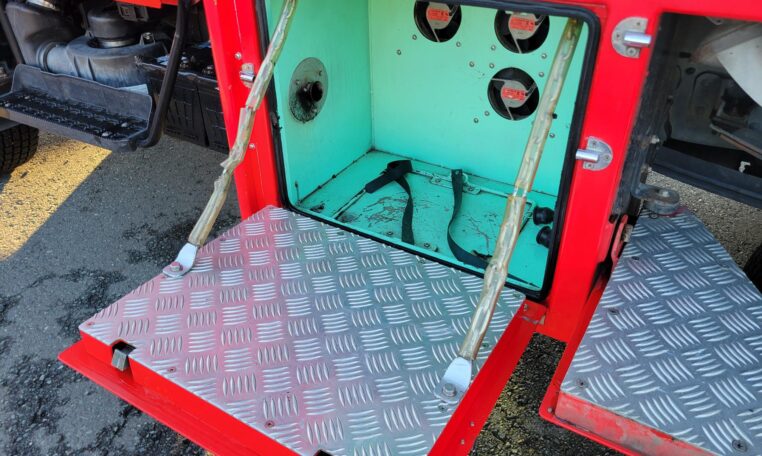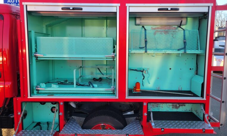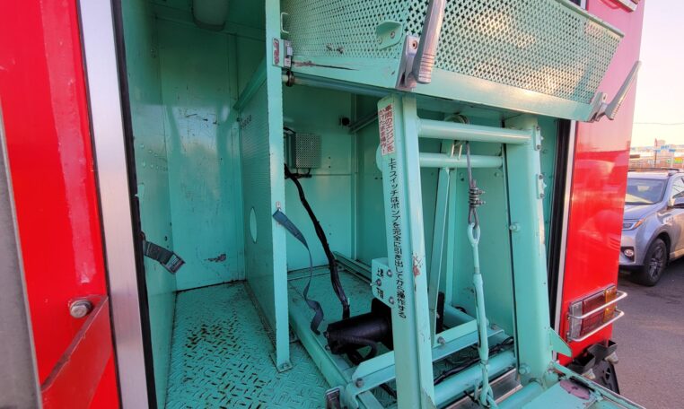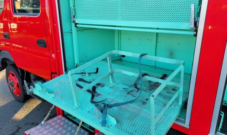 A tank of a unit, Hino Dutro 4WD decommissioned fire engine support vehicle. Unlike actual firetrucks, instead of a water pump, this example features a variety of different size compartments which allows number of uses without box modification. All interior panels are removable. You can increase the size of a compartment you need the most and make one big open space.