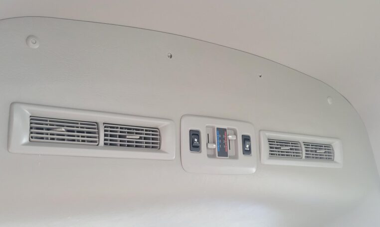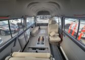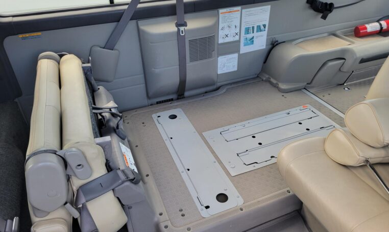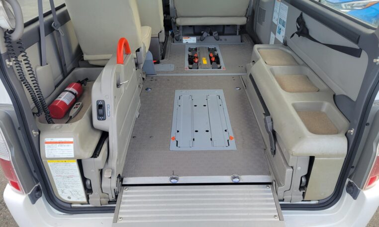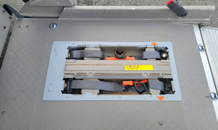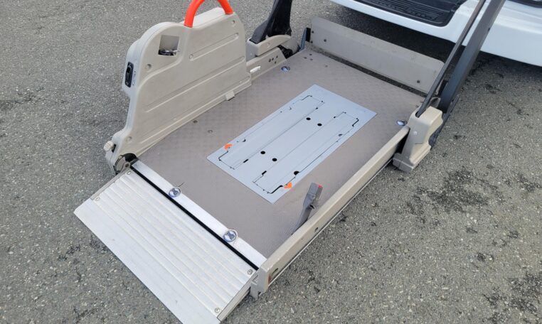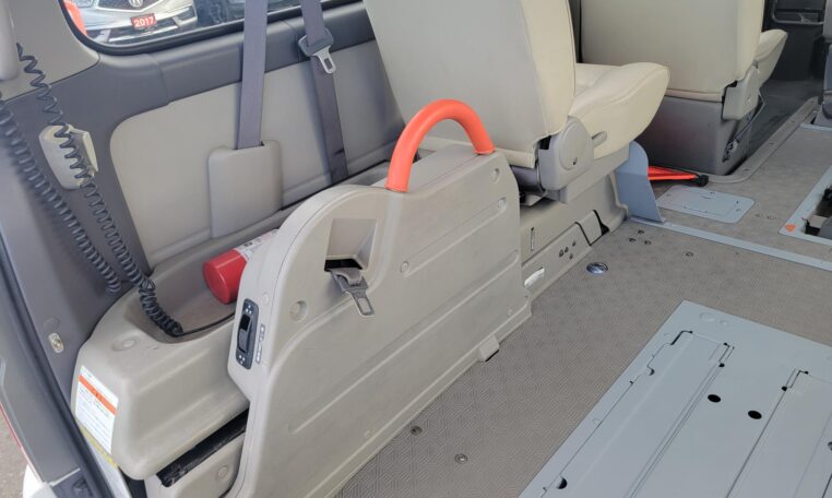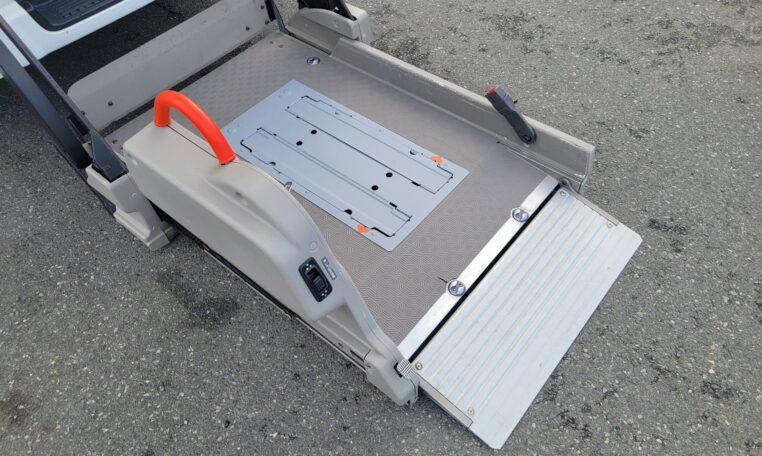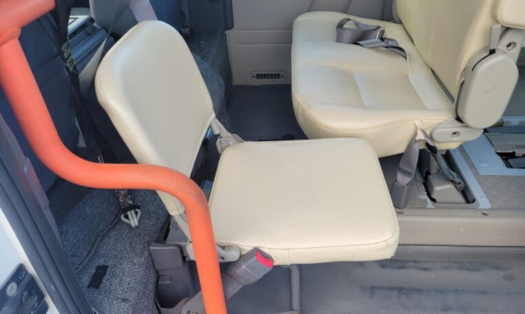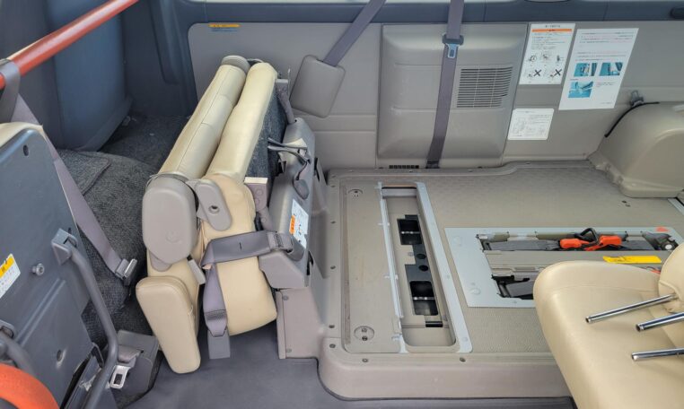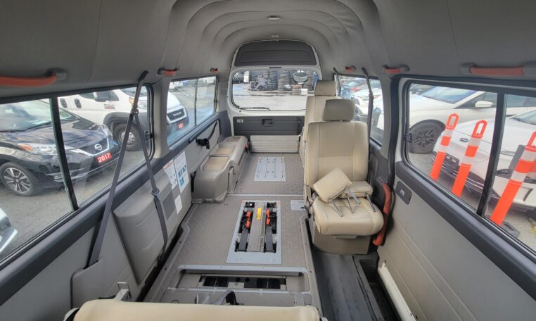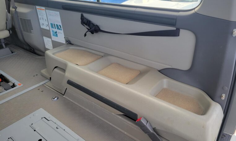 The van is equipped with a rear mounted hydraulic lift and was used to transport people who use wheelchair. The van has enough room to fit 2 wheelchairs and 7 passengers (+1 passenger for the rear facing seat, 8 in total). It has motorized straps to anchor wheelchairs to the floor to prevent movement during transportation. The lift capacity is 200 KG or 440 LB. Interior heights is 4.8 ft. The lift platform is 2.6′ wide and 4′ long.<br>
