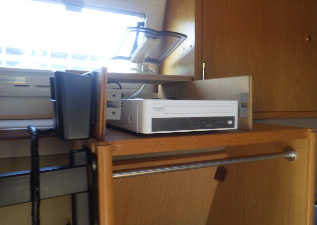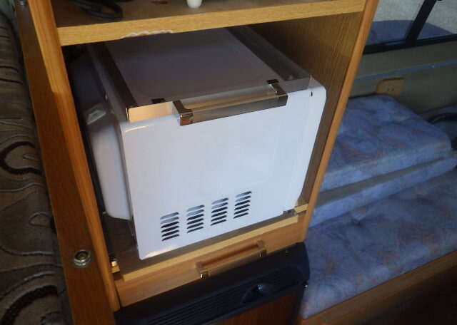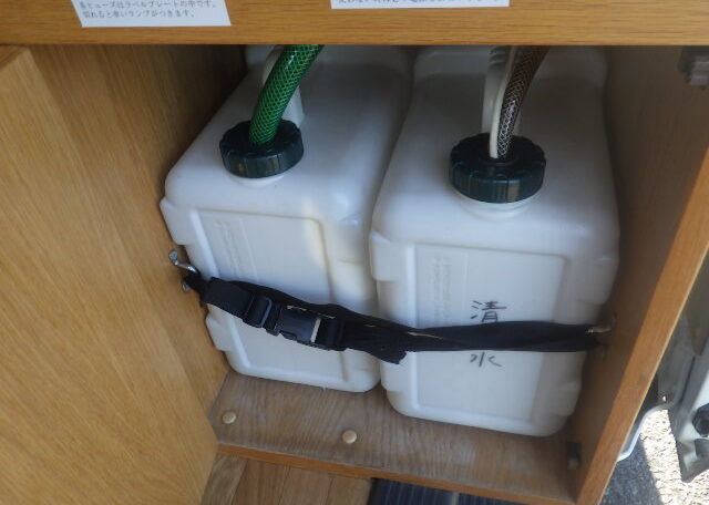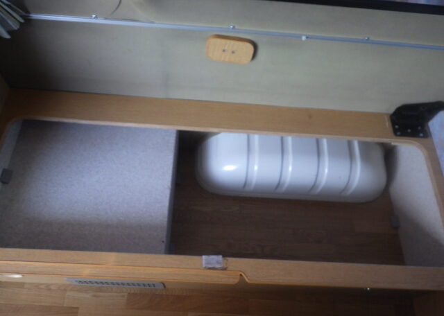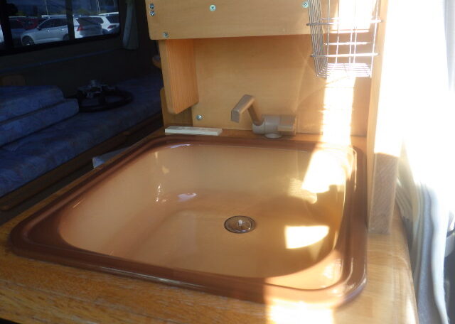 Sink with grey and fresh water canisters (about 20L each)